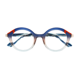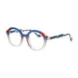 Face à Face Glimps 2 is a bold, round frame with exaggerated curves and a sculpted brow line that adds expressive character. Its layered acetate design showcases playful geometry and a distinctly artistic edge.